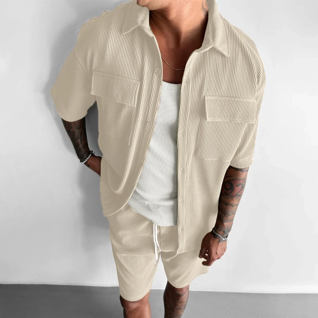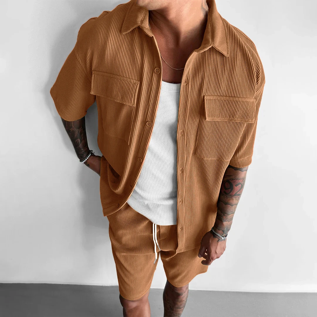 This men’s summer corduroy set is designed for casual and outdoor wear.